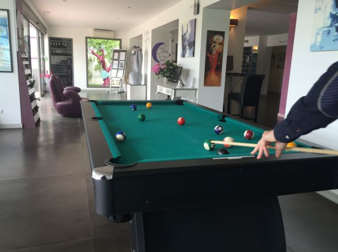 Alles wurde darauf ausgelegt, den Salon zu einem freundlichen Ort zum Leben zu machen: WLAN-Verbindung, Bar, Selbstbedienungsbibliothek, lokale Zeitung, Billard und Fernsehen. Ideal für einen Moment der Entspannung, alleine oder mit Freunden, vom Morgenkaffee bis zum Digestif, zur Teezeit oder nach der Arbeit.