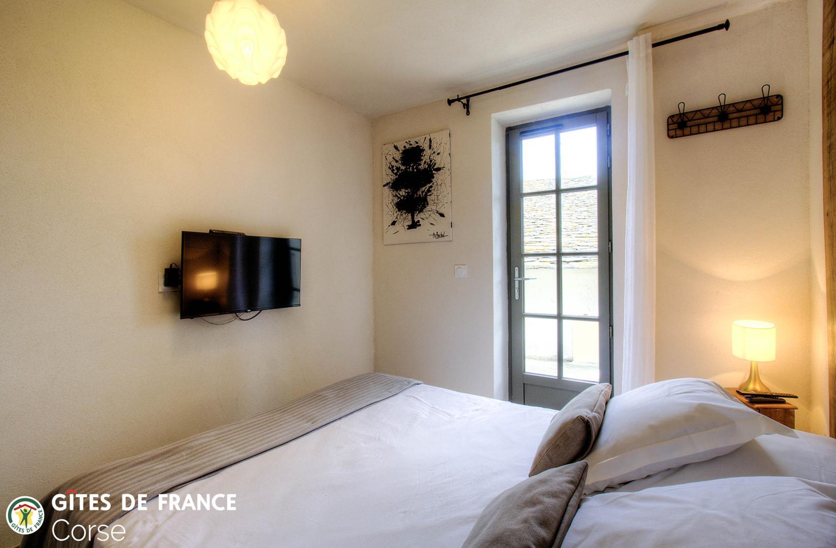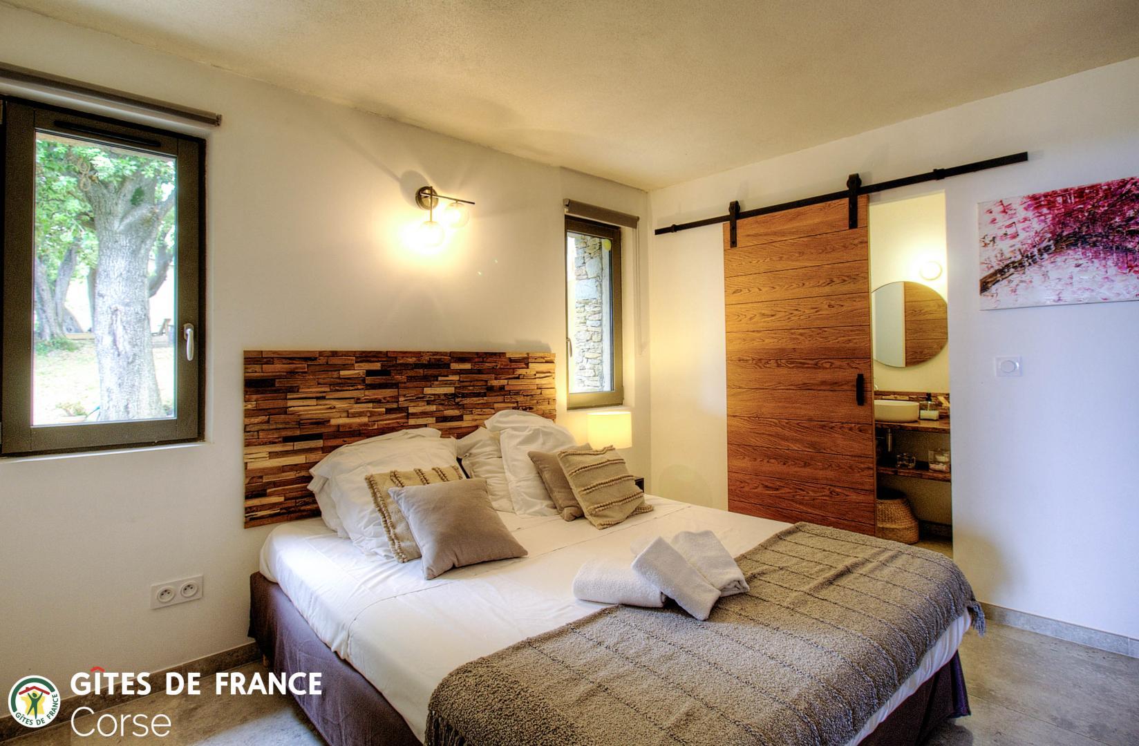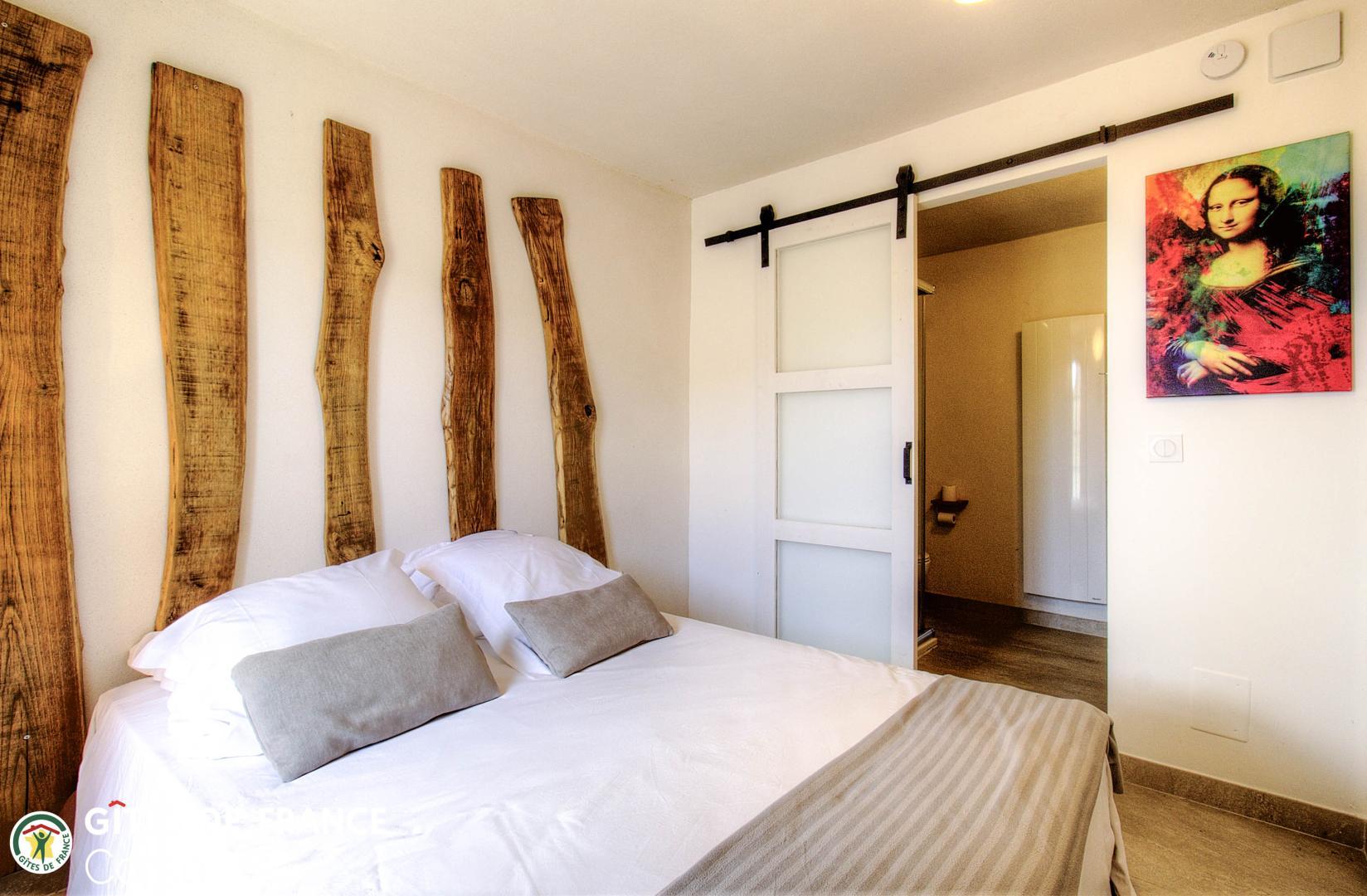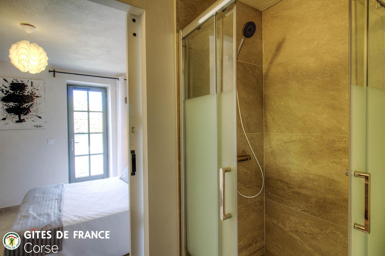- 1 chambre de 7.6 m² comprenant 1 lit 140x190cm avec salle d'eau/WC attenante avec porte-fenêtre
