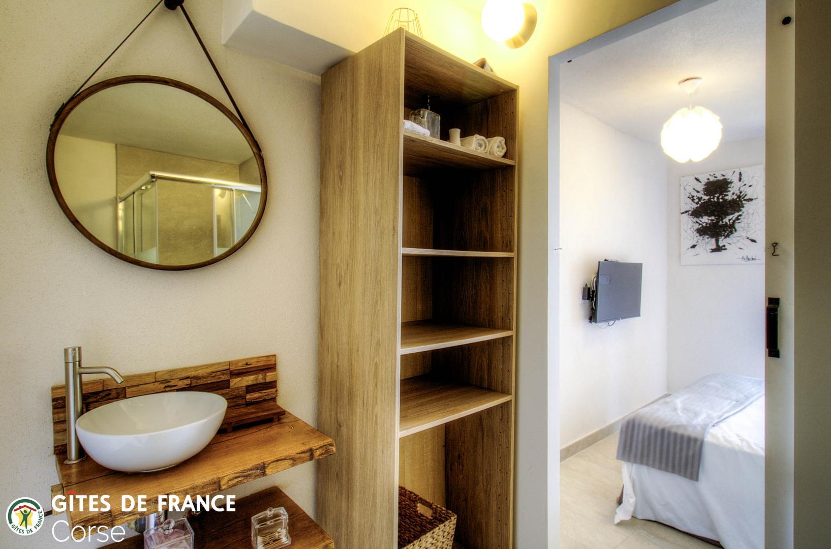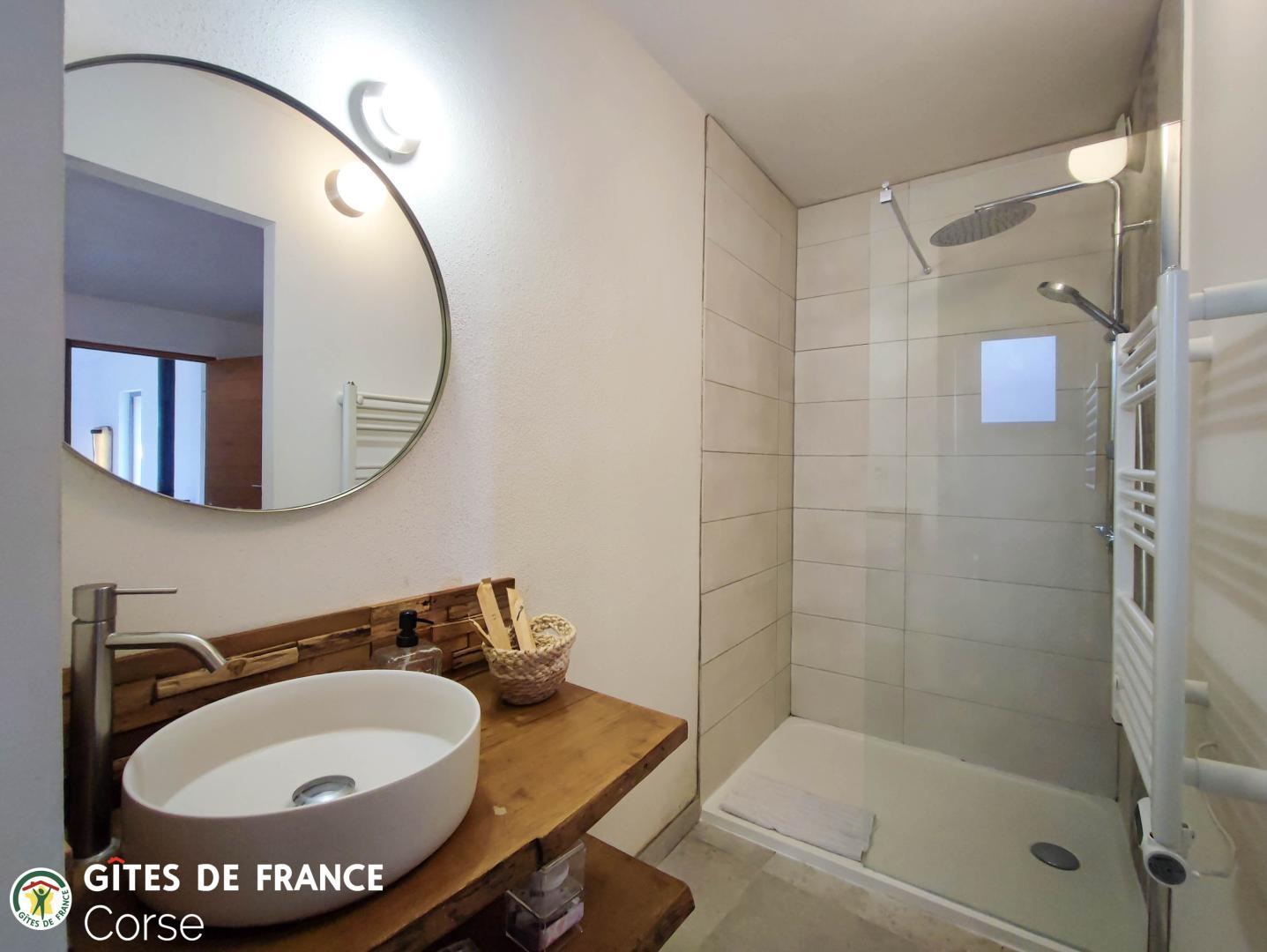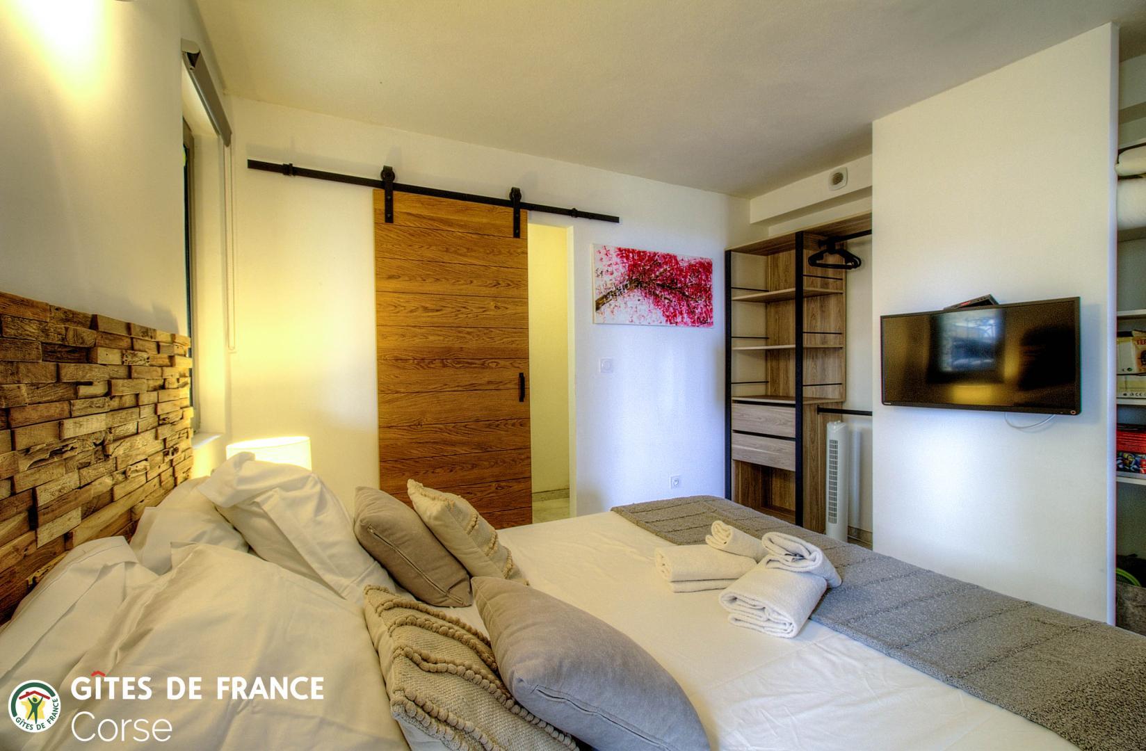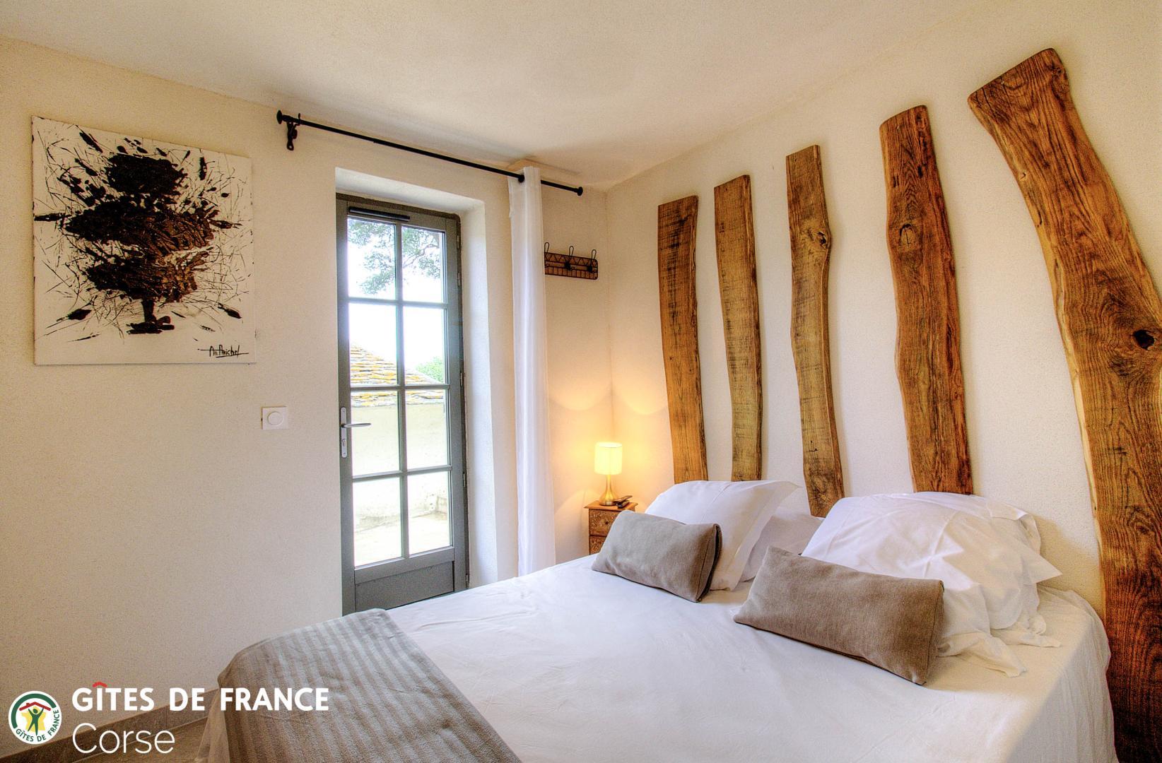 - 1 chambre de 7.6 m² comprenant 1 lit 140x190cm avec salle d'eau/WC attenante avec porte-fenêtre