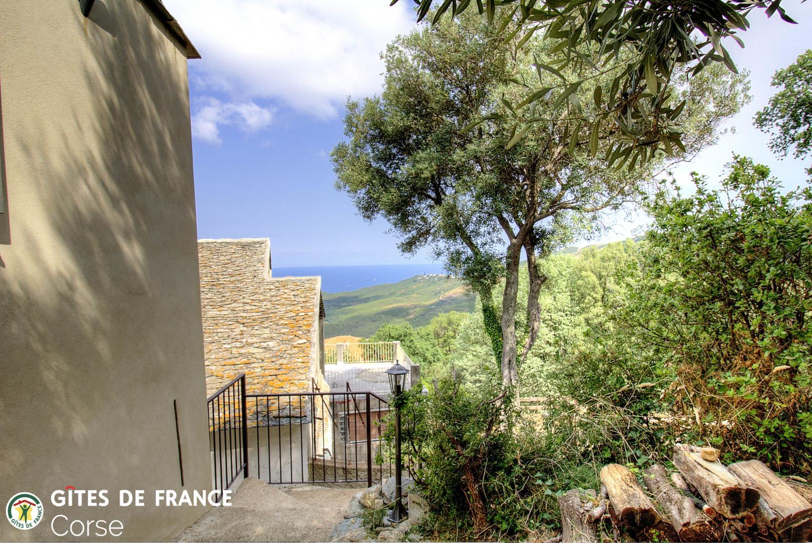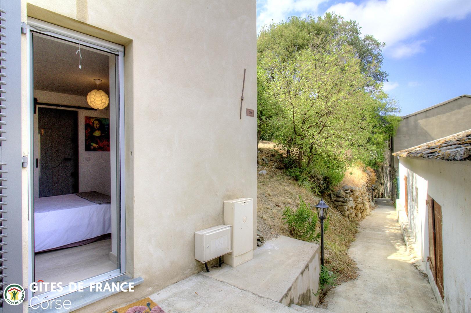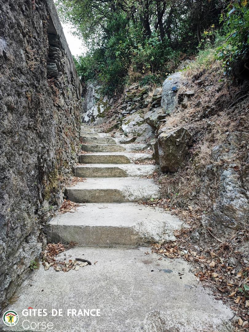 Accès au gîte par une ruelle publique d'environ 70 mètres, avec deux escaliers d'une trentaine de marches