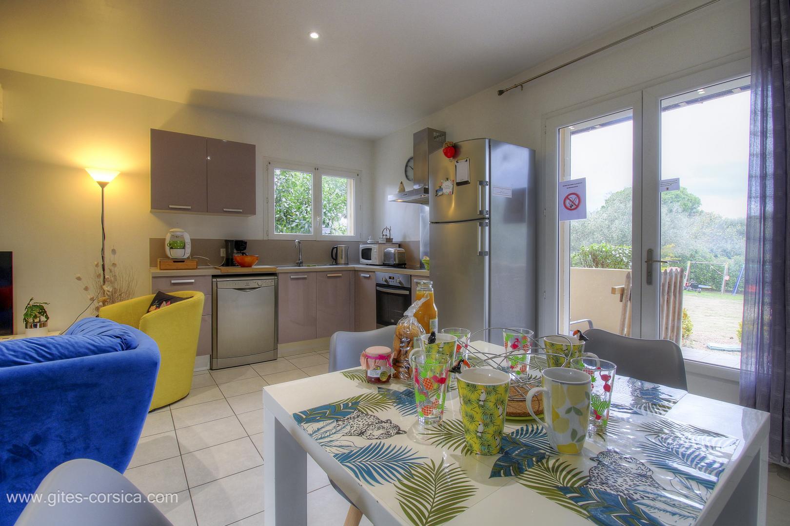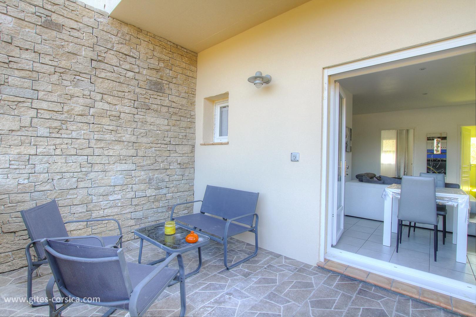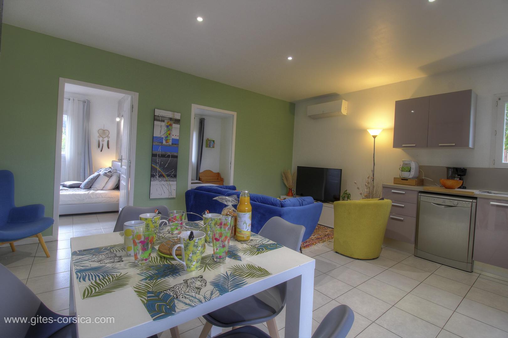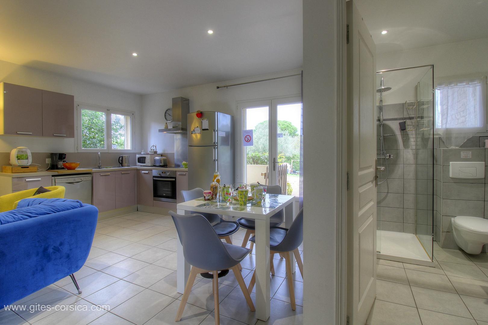 In der Nähe des südlichen Ausgangs von Porto-Vecchio befindet sich eine Wohnung von 50 qm im Erdgeschoss des Hauses der Eigentümer und die angrenzende Ferienhaus 24311. Sie setzt sich wie folgt zusammen :