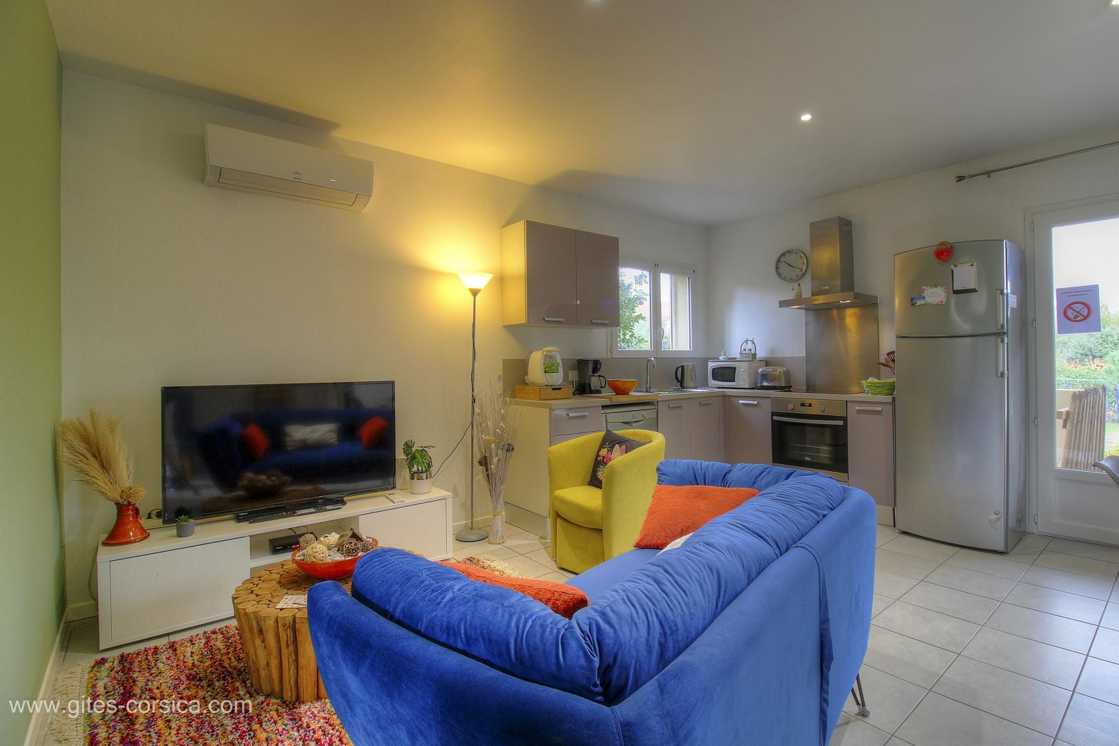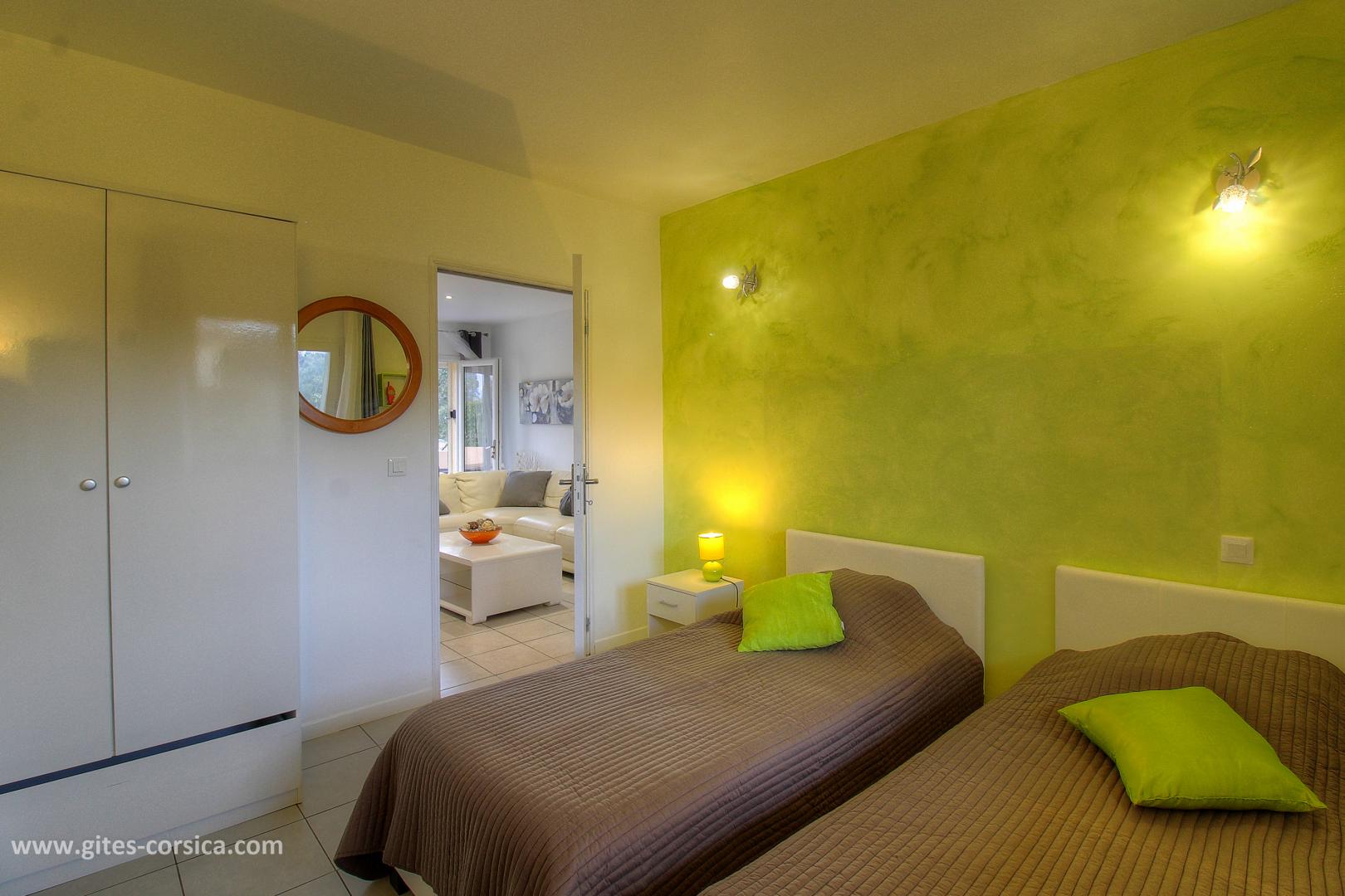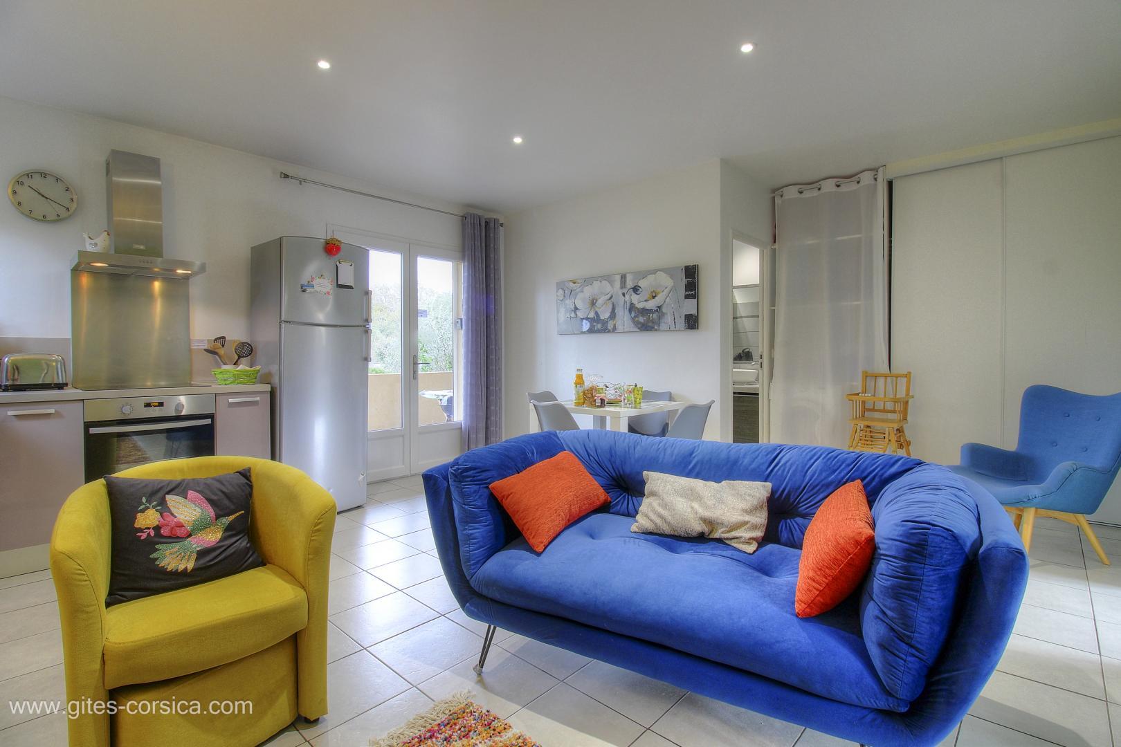 In der Nähe des südlichen Ausgangs von Porto-Vecchio befindet sich eine Wohnung von 50 qm im Erdgeschoss des Hauses der Eigentümer und die angrenzende Ferienhaus 24311. Sie setzt sich wie folgt zusammen :
