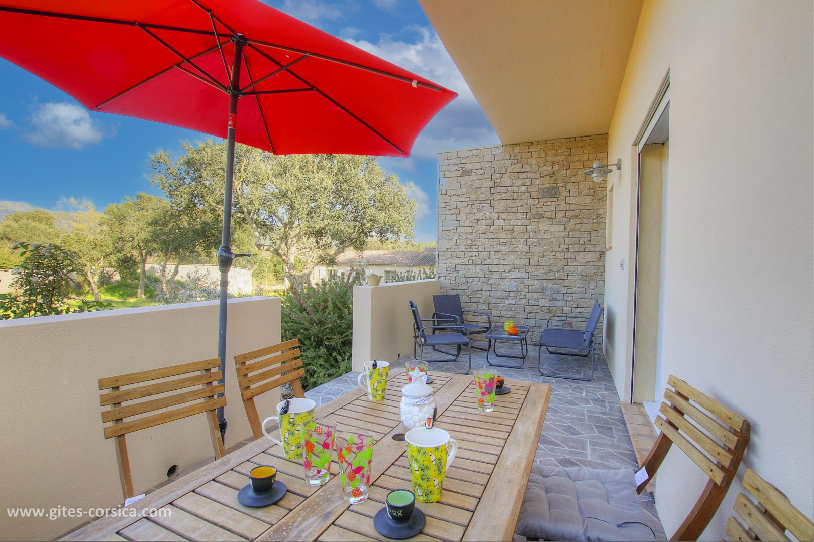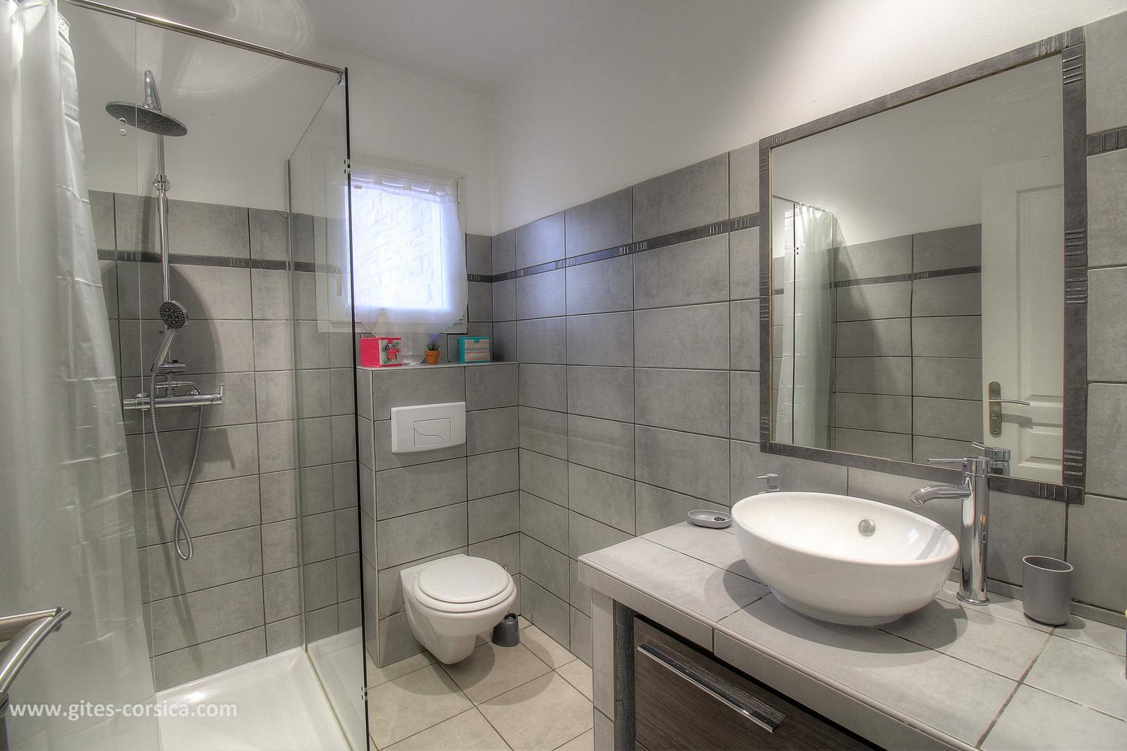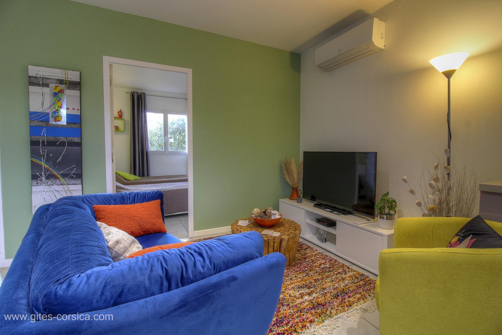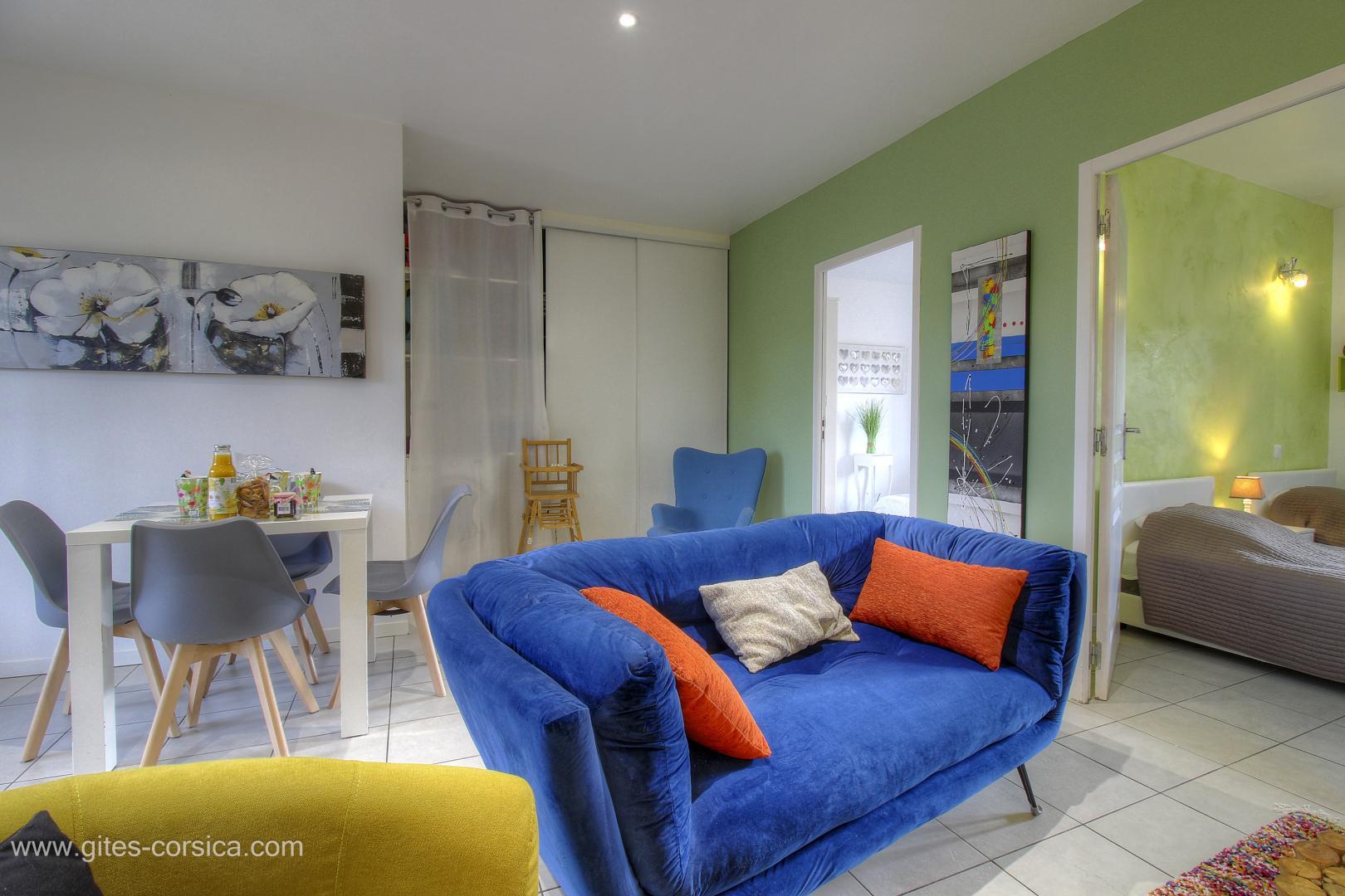 In der Nähe des südlichen Ausgangs von Porto-Vecchio befindet sich eine Wohnung von 50 qm im Erdgeschoss des Hauses der Eigentümer und die angrenzende Ferienhaus 24311. Sie setzt sich wie folgt zusammen :