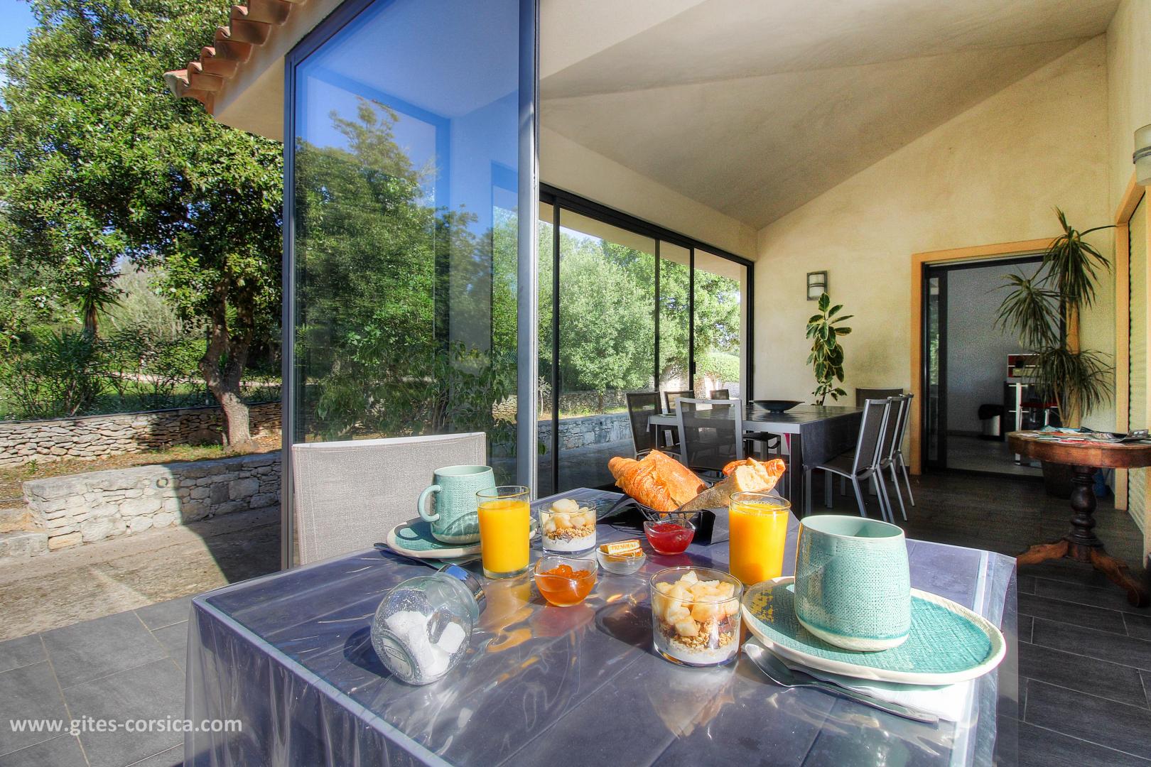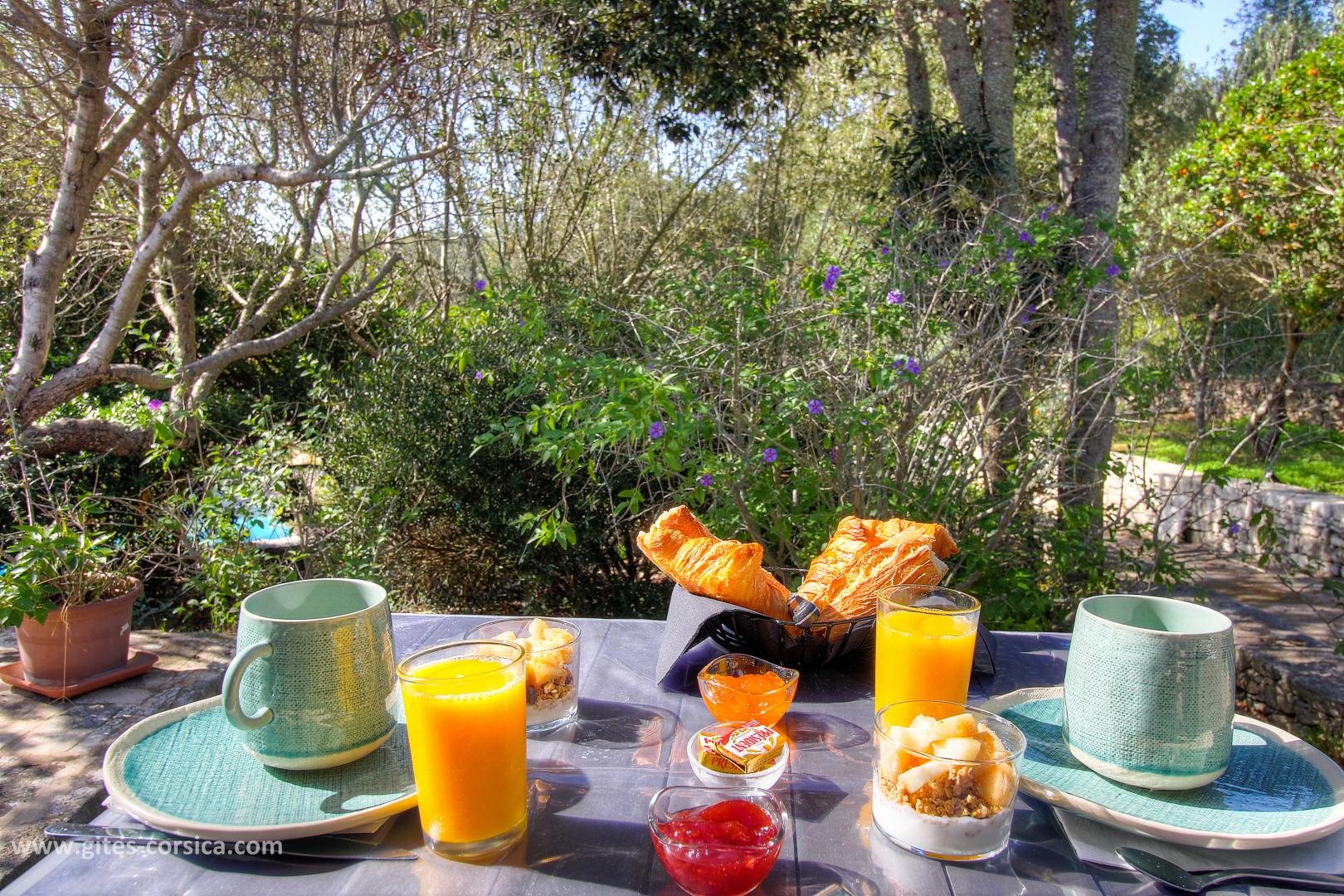 Das Frühstück wird im Esszimmer (Veranda) serviert. Es besteht aus heißen Getränken, Brot, Gebäck, Milchprodukten, Marmeladen und Fruchtsäften.