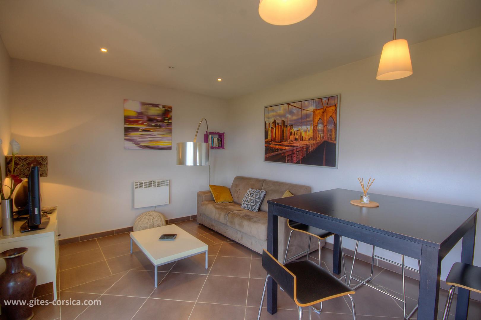À l'intérieur la décoration moderne vous séduira et le bon niveau d'équipement vous permettra de passer un séjour agréable. Vous apprécierez de vous détendre sur votre terrasse en admirant la vue dégagée sur le golf de Calvi et pour que la détente soit totale, vous bénéficierez d'une piscine commune chauffée.