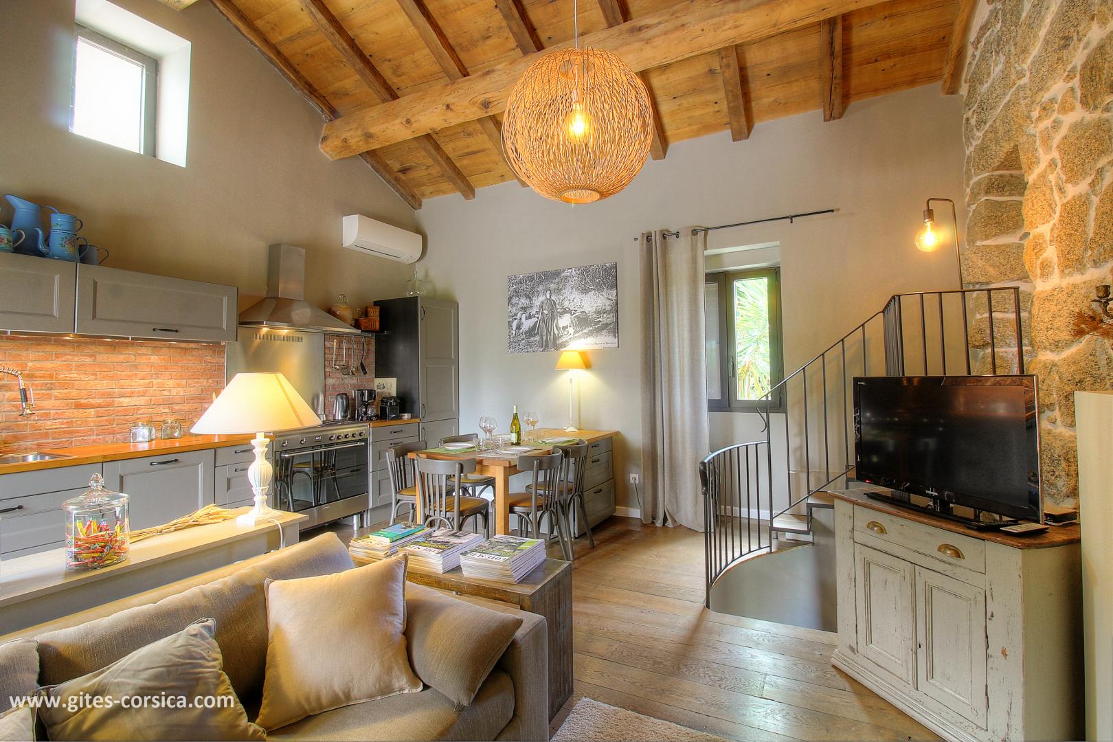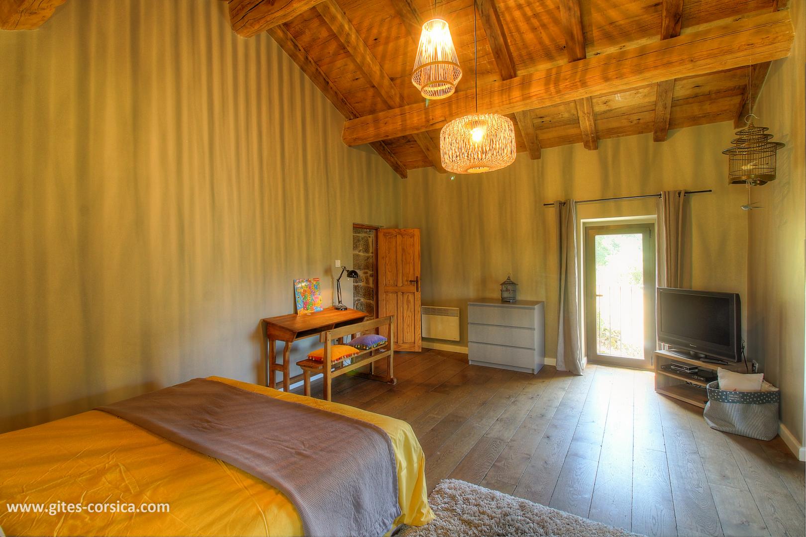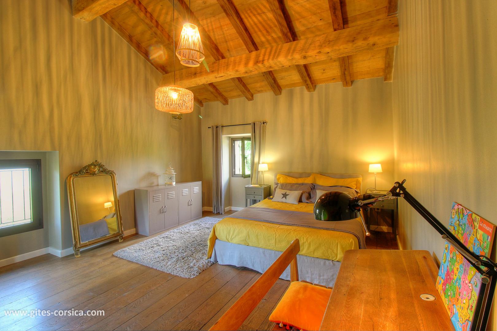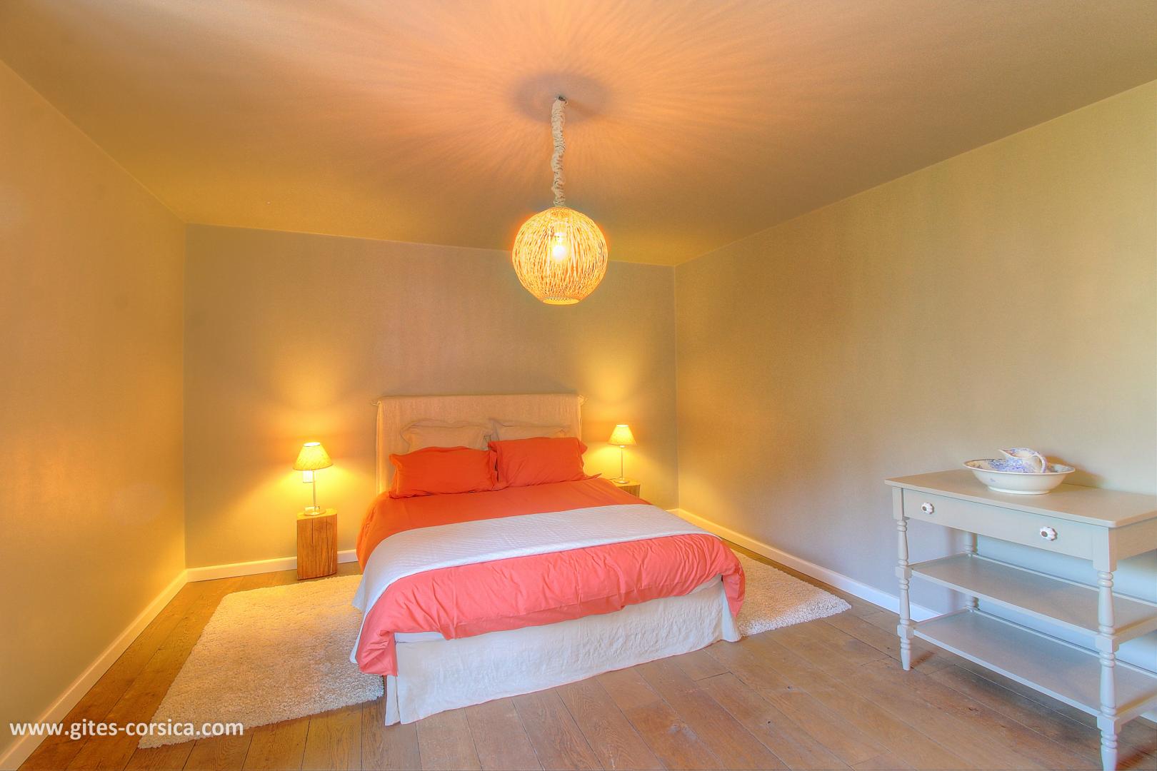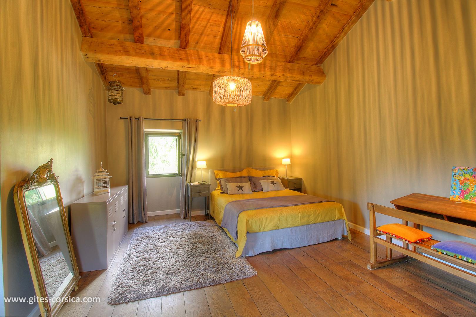 - 1 Schlafzimmer mit 1 Bett 160 x 200 cm, das über einige Stufen zugänglich ist (schmaler Durchgang).