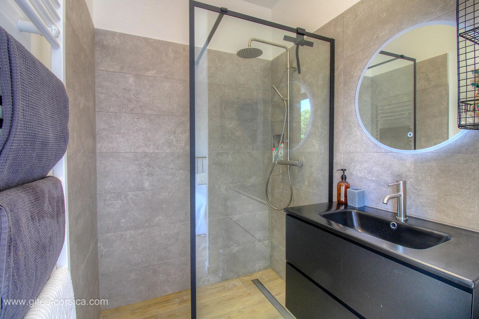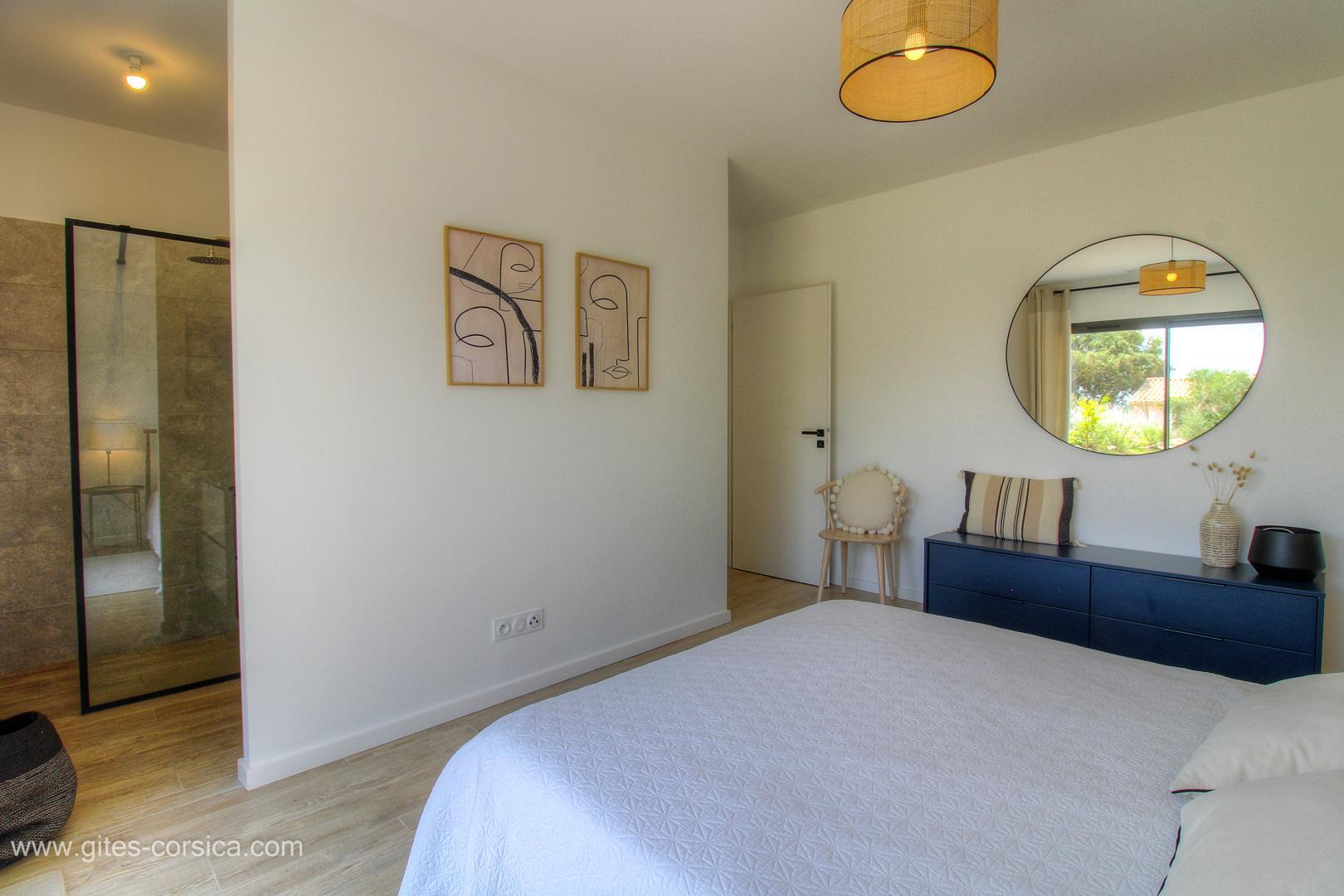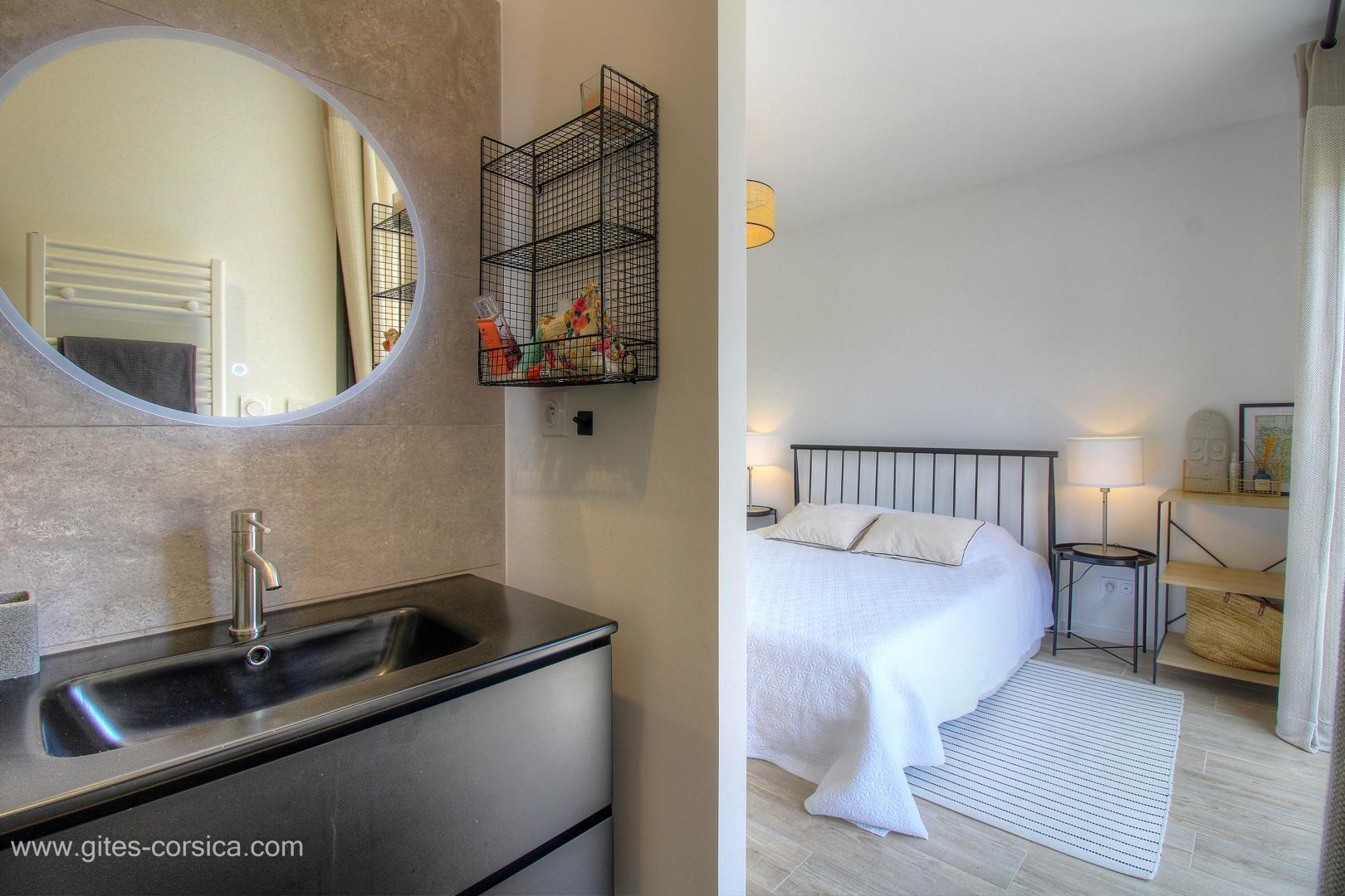 - 1 Zimmer mit 1 Bett 160 x 200 cm mit offenem Badezimmer zum Zimmer hin