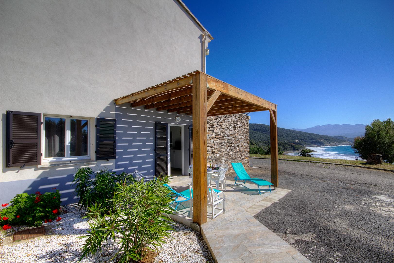 400 Meter vom Strand entfernt, auf einem Grundstück von 5000 qm, Ferienhaus von 41,8 qm im Erdgeschoss eines Einfamilienhauses mit 2 weiteren Vermietungen (im Erdgeschoss) und die Wohnung der Besitzer (im Obergeschoss). Es setzt sich wie folgt zusammen :