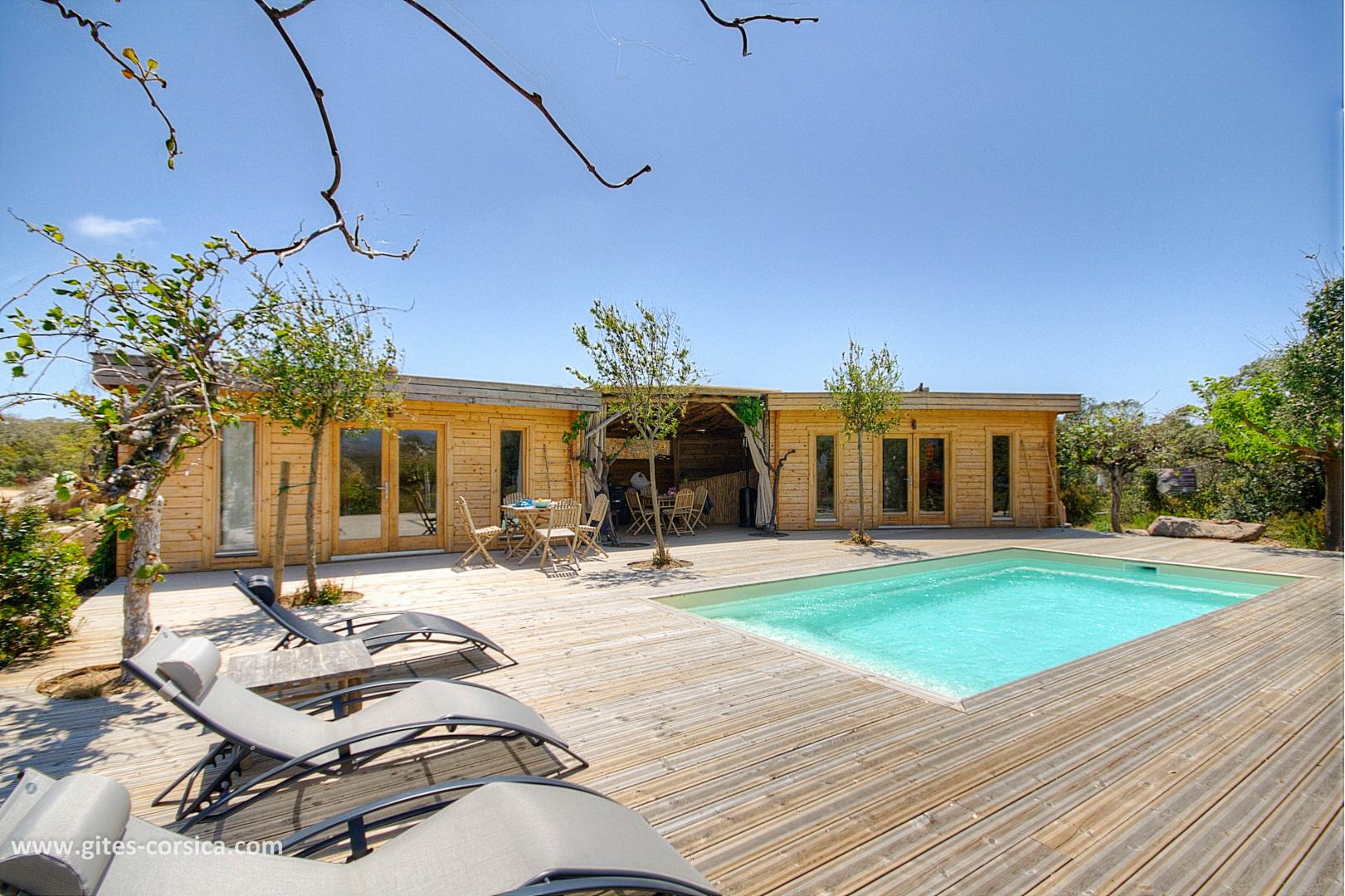 Auf einem Grundstück von 2.5 Hektar am Rande der Mündung von Figari befindet sich ein Holzhaus, das von 3 Gästezimmer isoliert ist, die Pascal ebenfalls anbietet.