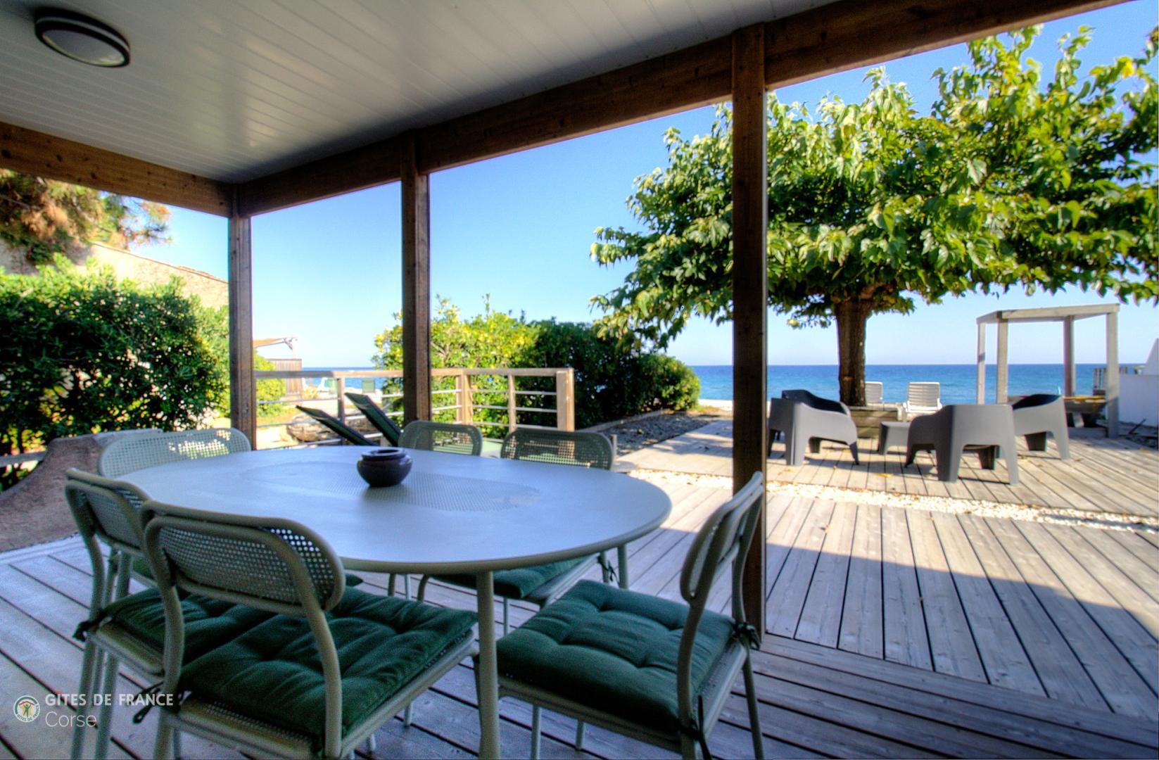 - Halbüberdachte Terrasse von 33 m² an der Vorderseite der Unterkunft.