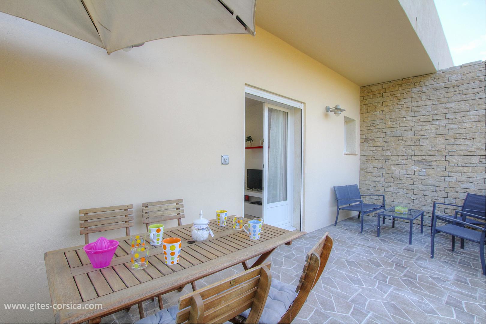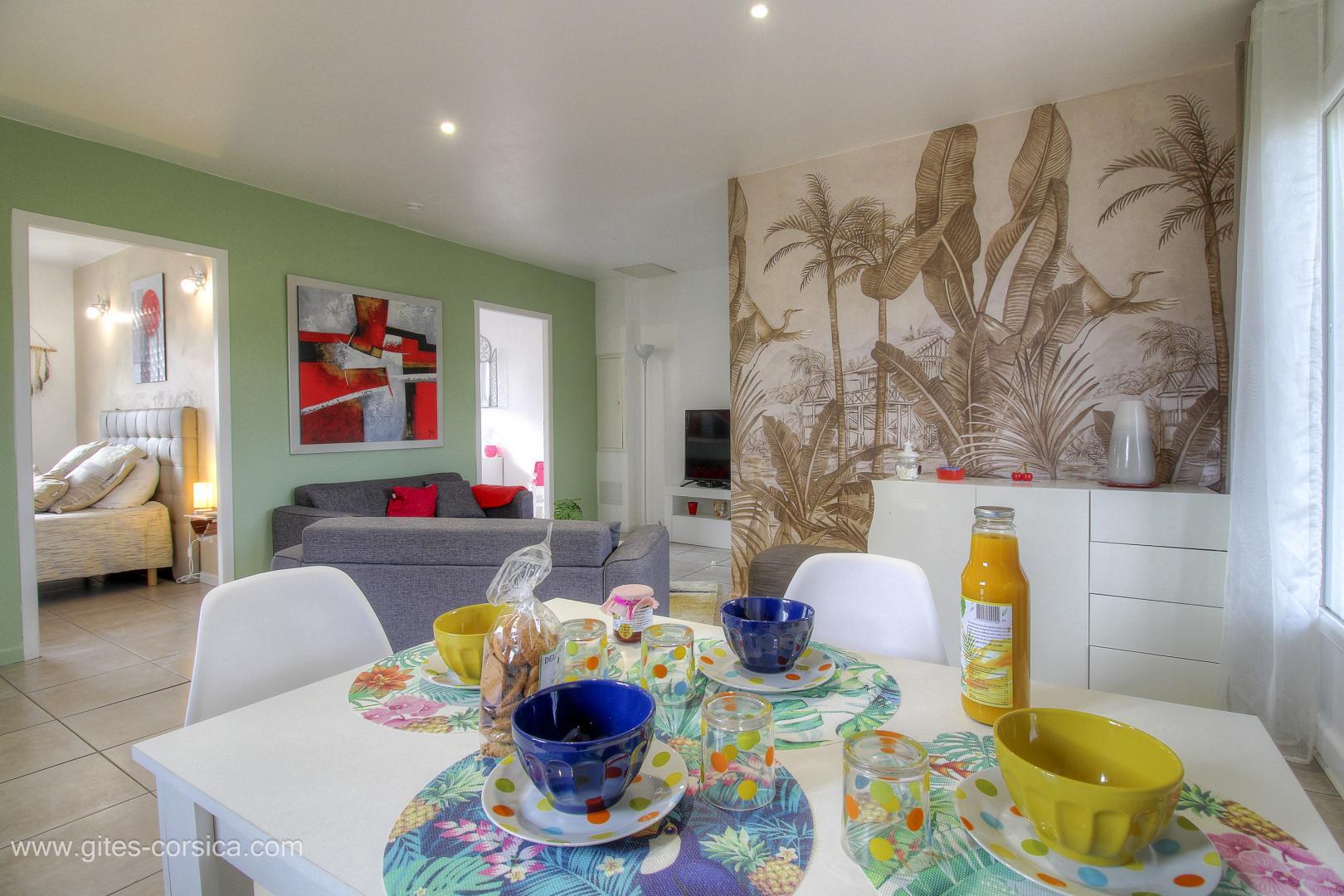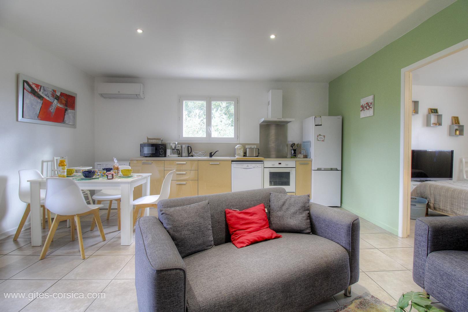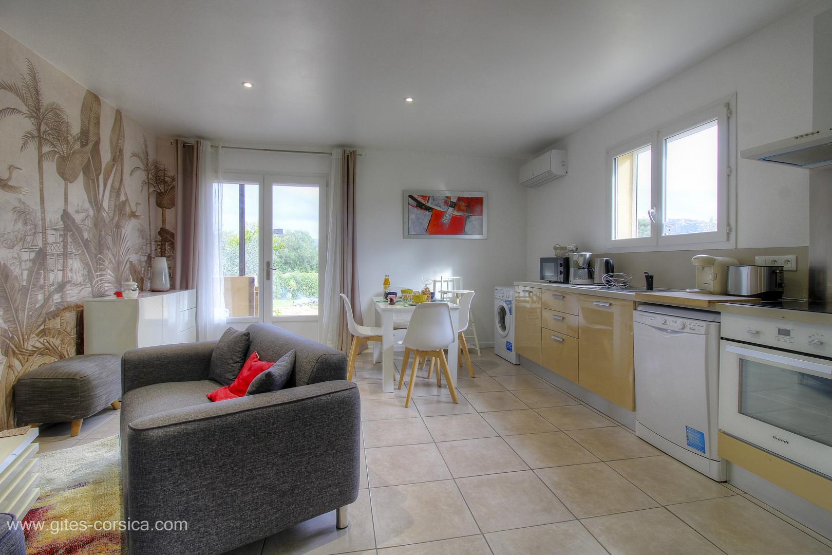 In der Nähe des südlichen Ausgangs von Porto-Vecchio befindet sich eine Wohnung von 50 qm im Erdgeschoss des Hauses der Eigentümer und die angrenzende Ferienhaus 24312. Sie setzt sich wie folgt zusammen :