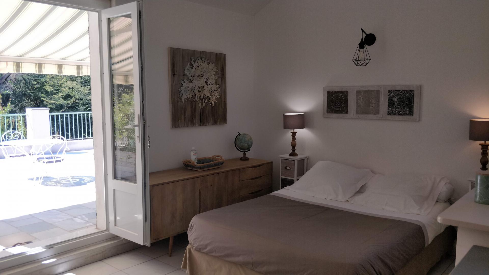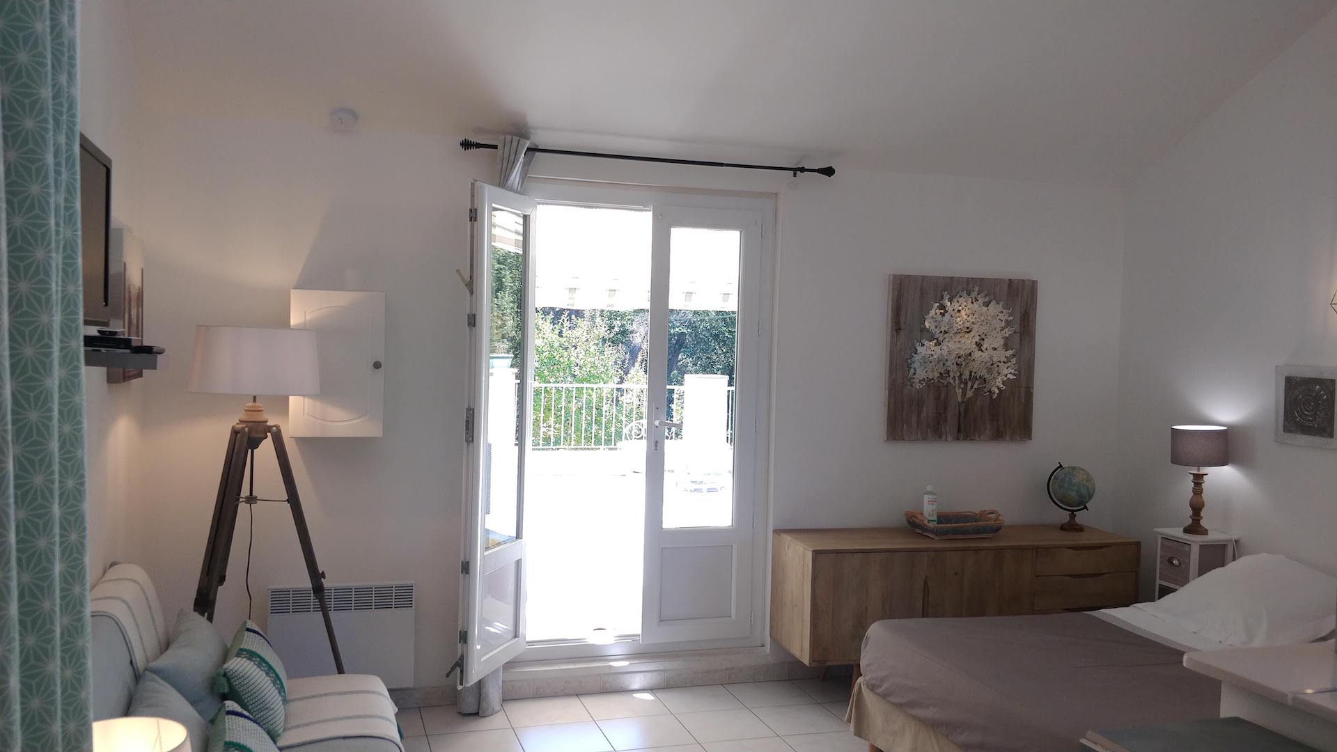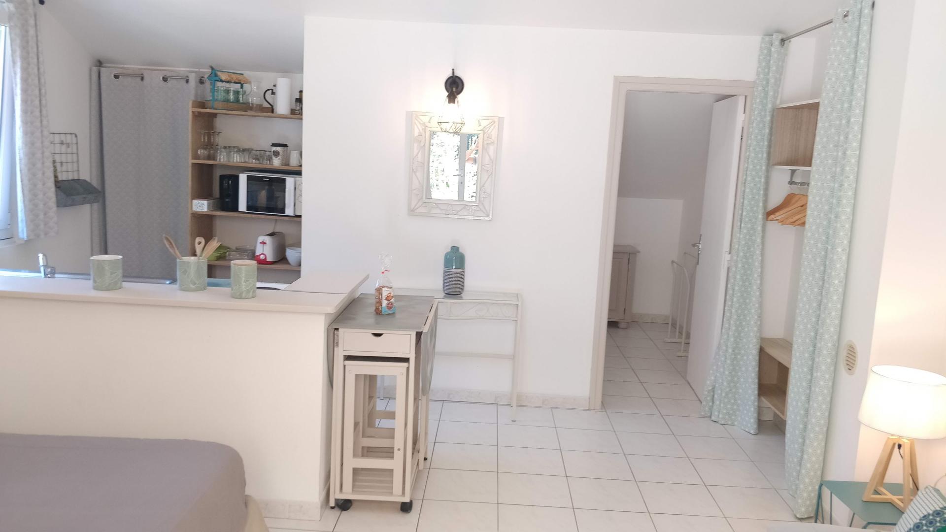 Ce studio est idéal pour un couple. Il jouit d'une terrasse de 55 m² avec salon de jardin et chaises longues, donnant sur une propriété arborée parfaitement entretenue. Vous profiterez également d'une piscine commune.