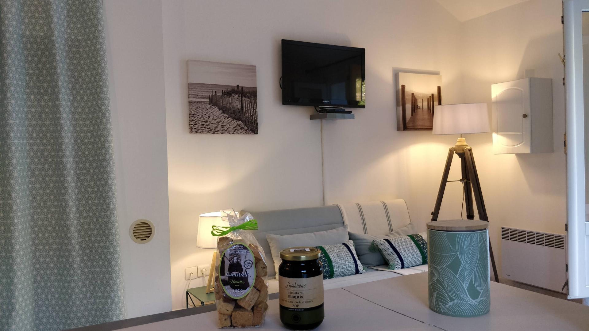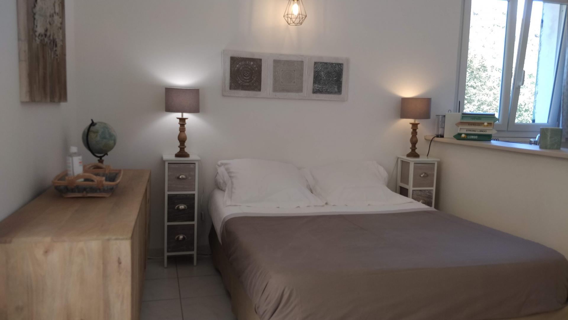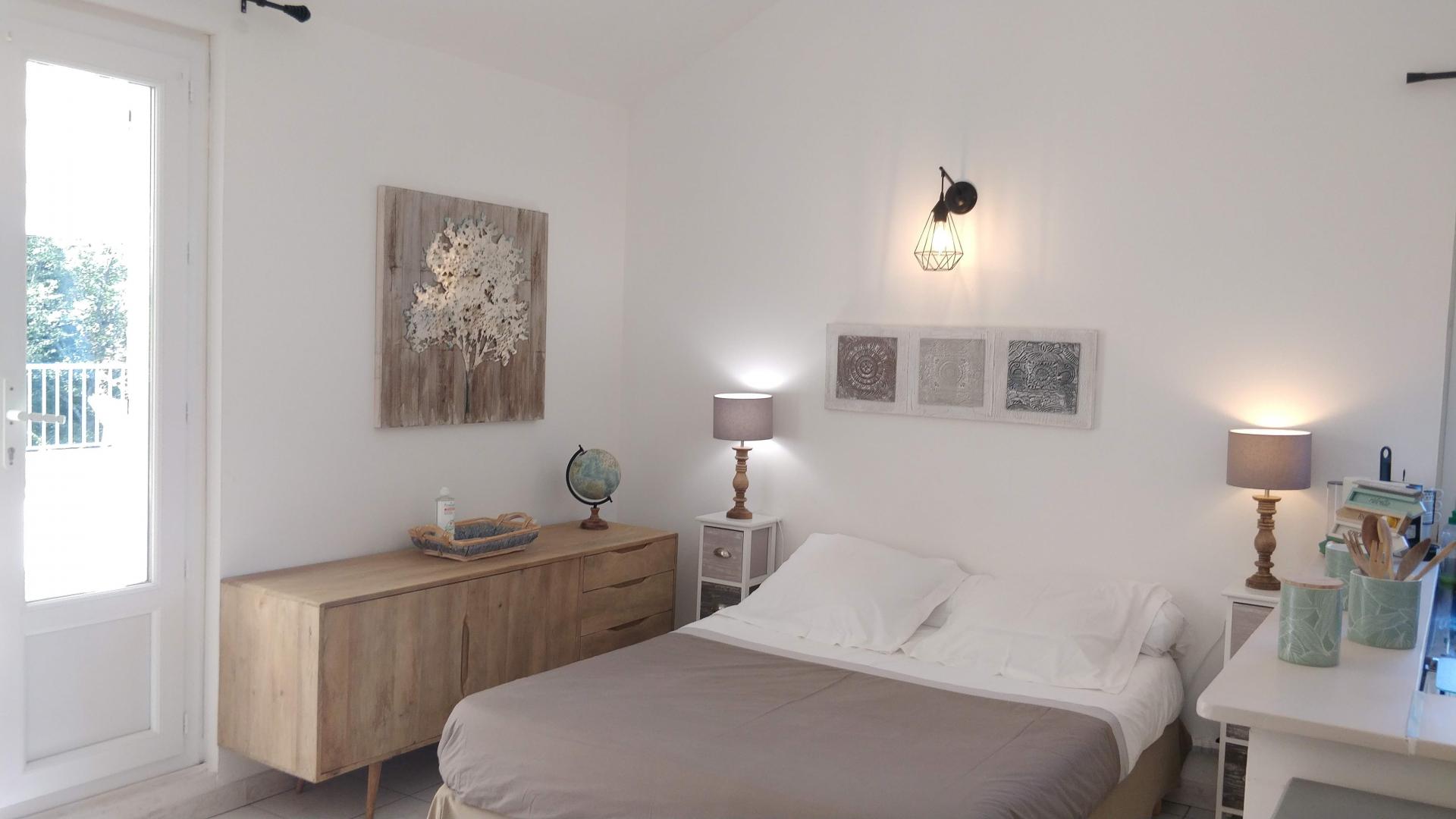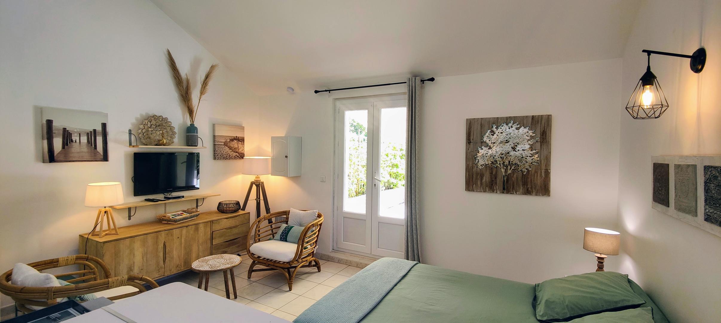 Ce studio est idéal pour un couple. Il jouit d'une terrasse de 55 m² avec salon de jardin et chaises longues, donnant sur une propriété arborée parfaitement entretenue. Vous profiterez également d'une piscine commune.