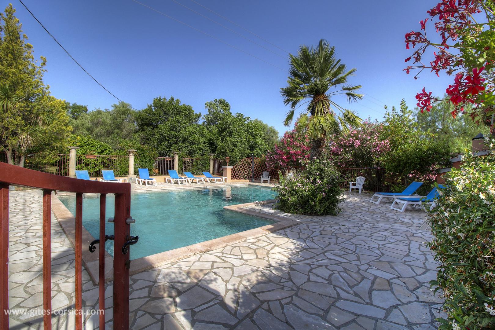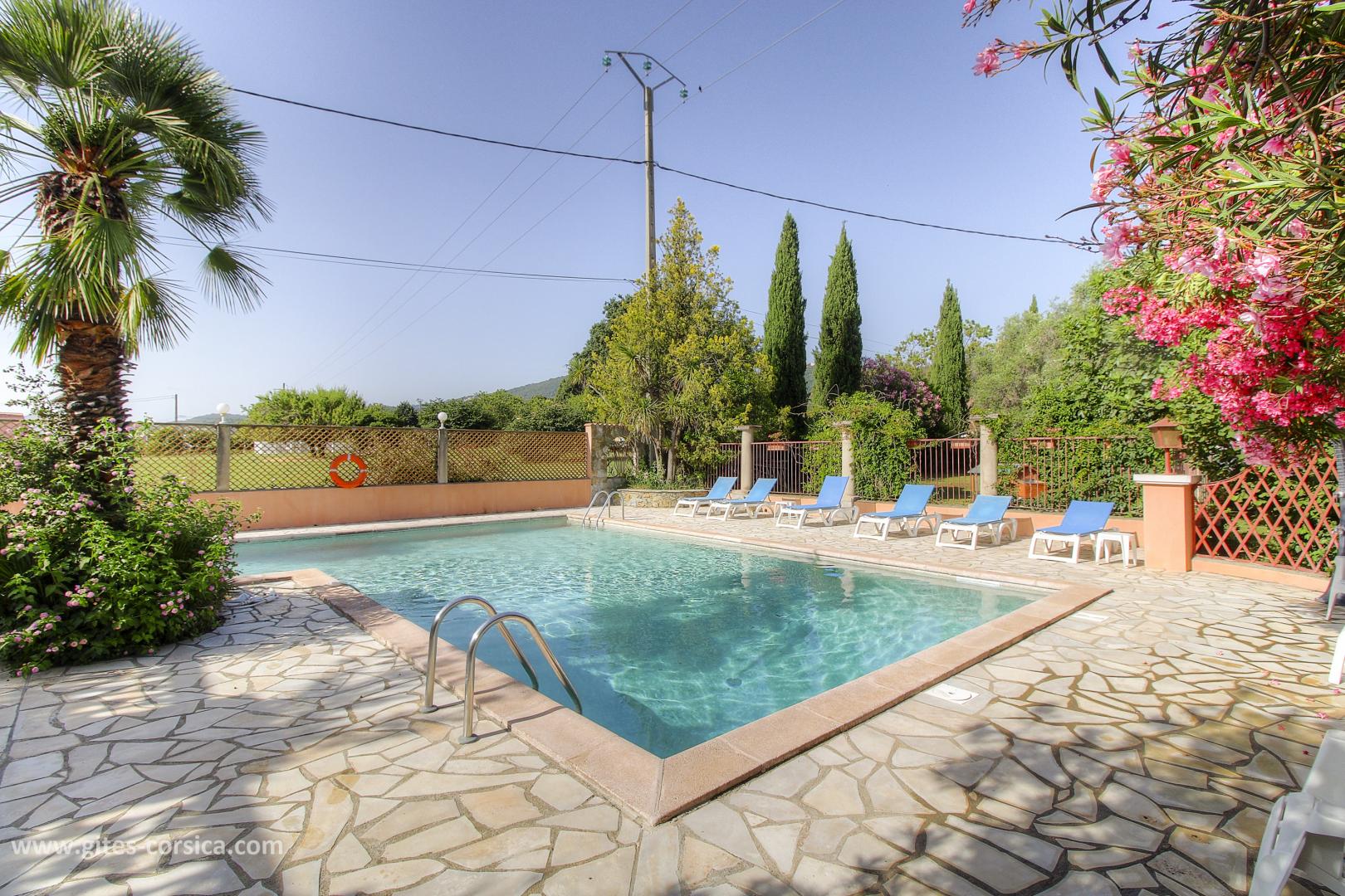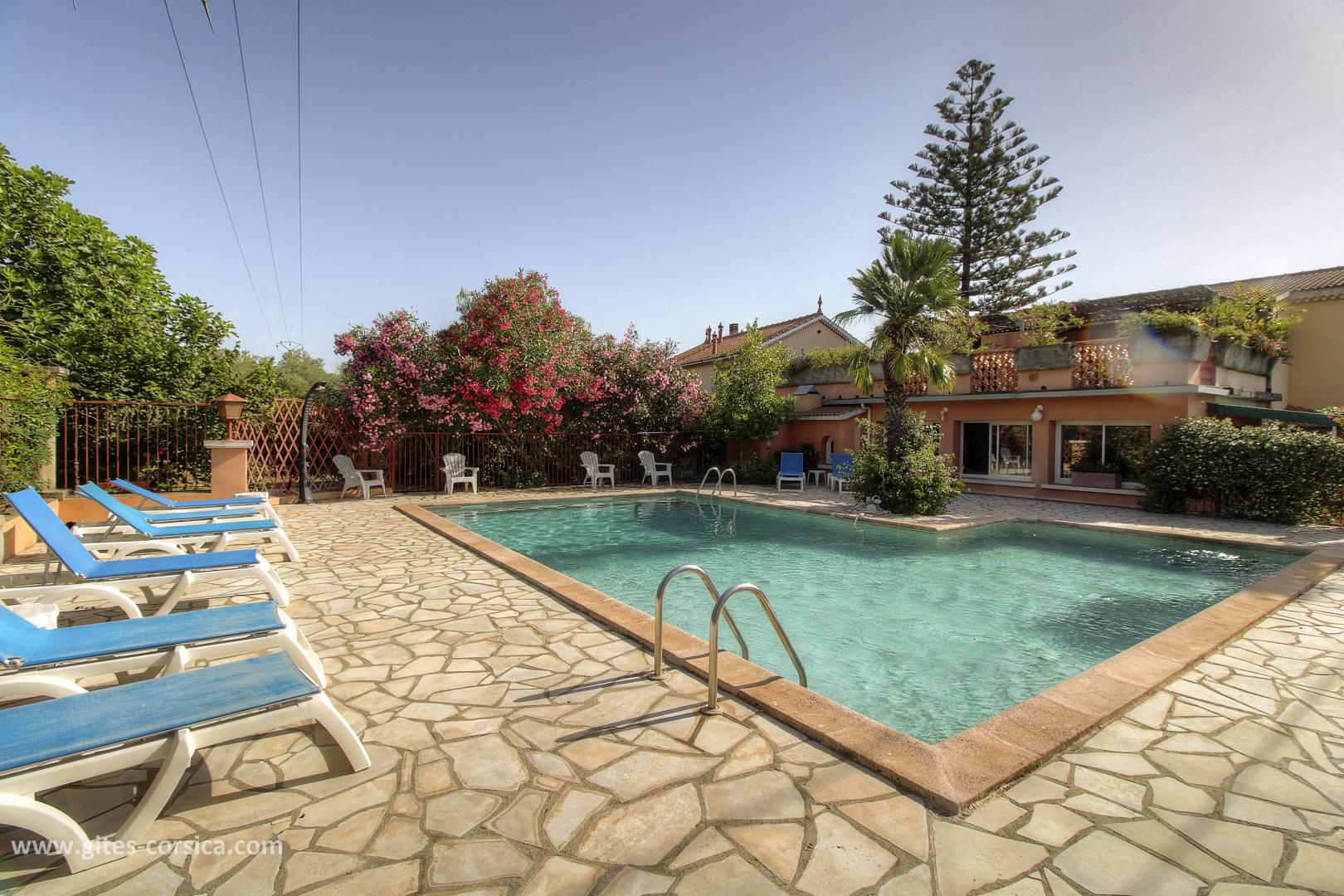 - Schwimmbad von 100 qm, geöffnet vom 01.05. bis 30.09. (9.00-12.00, 14.00-19.00), gesichert durch eine Schutzbarriere. Der Pool steht ausschließlich den Mietern zur Verfügung.