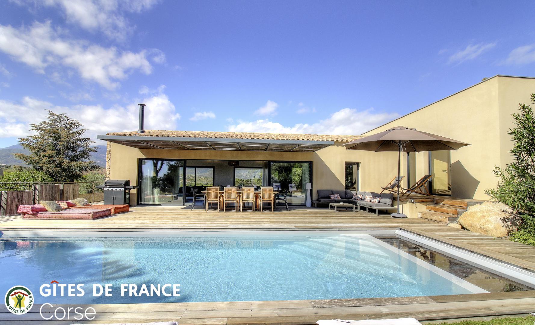 - Privater Pool, der während der Mietzeit geöffnet ist (6,5 x 4 Meter, Tiefe: 1,5 Meter) und beheizt wird (außer Juli/August) und durch einen Rollladen gesichert ist. Der Pool steht ausschließlich den Mietern zur Verfügung.