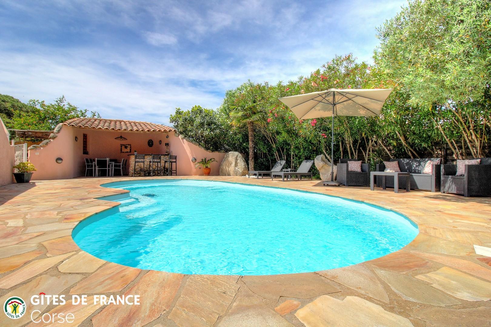 - Privatpool (7 x 3,5 m, Tiefe: 1,7 m), während der Mietzeit geöffnet, durch ein Tor gesichert, der Pool ist ausschließlich für die Mieter bestimmt.